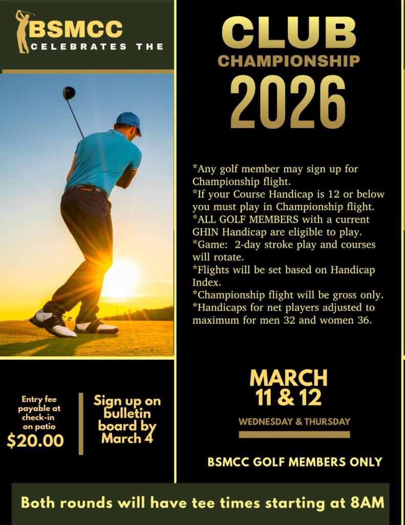 The most prestigious title of the year — CLUB CHAMPION — will be hosted at BSMCC this year on March 11th and 12th.