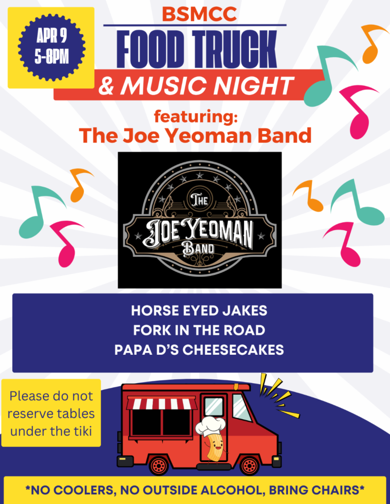 Come by for cold drinks from the BSMCC food truck or our lanai bar, enjoy food from food trucks in our parking lot (this week we have In a Pickle, Taters, and Horse Eyed Jakes), and enjoy the music!